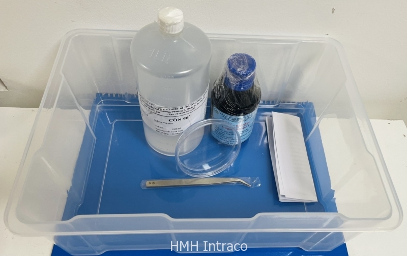 - Đĩa petri (bằng nhựa); Panh (bằng inox); hộp nhựa màu trắng trong kích thước: (36x26x14)cm; Cồn 70 độ (chai 1000ml); Dung dịch iode 1% (chai 200ml)