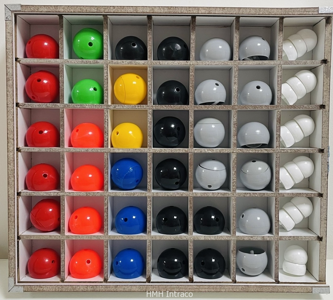 - 13 nắp bán cầu (trong đó 2 nắp màu đen, 3 nắp màu ghi, 2 nắp màu đỏ, 1 nắp màu xanh lá cây, 1 nắp màu xanh coban, 1 nắp màu vàng, 3 nắp màu trắng).