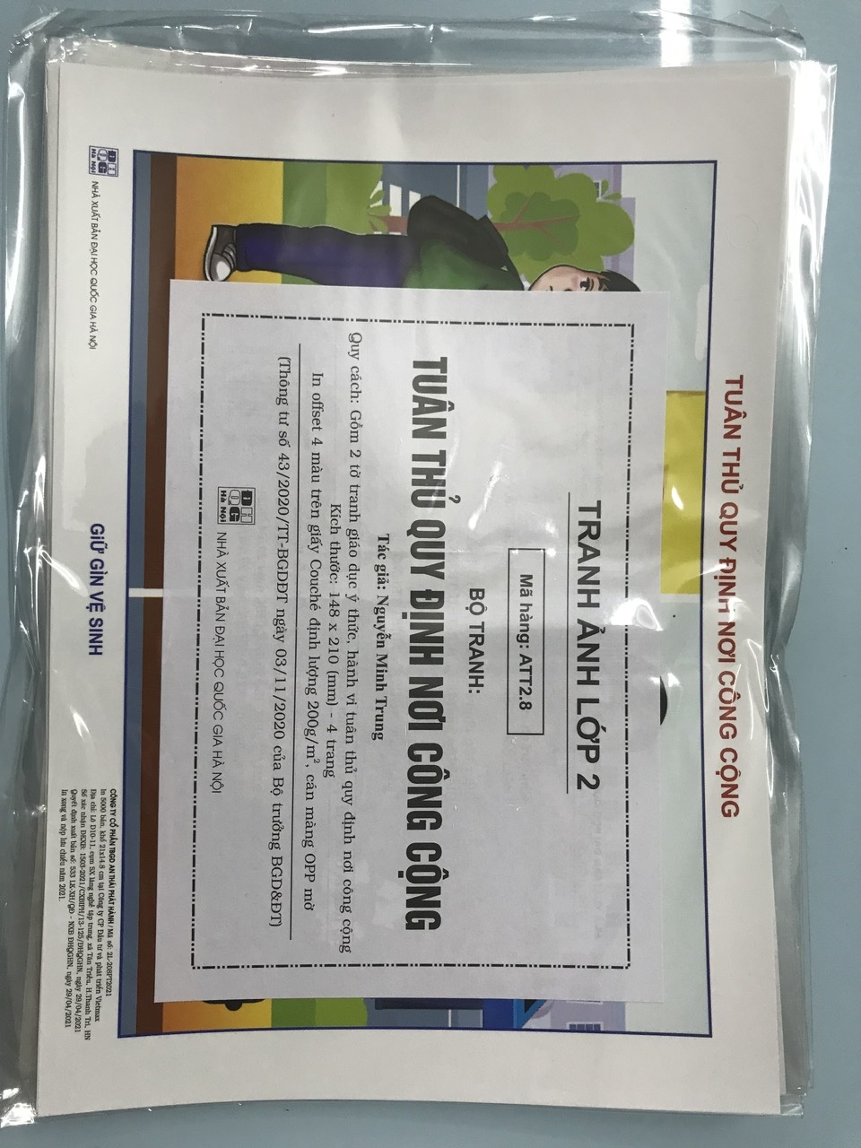 Bộ tranh thực hành gồm 02 tờ, kích thước (148x210)mm, in offset 4 màu trên giấy couche định lượng 200g/m2, cán láng OPP mờ (có thể thay thế bằng tranh/ảnh điện tử); nội dung tranh thể hiện thái độ, hành vi biết và không biết tuân thủ quy định nơi công cộng: