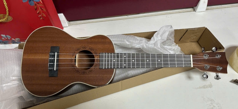 Loại ukulele concert làm bằng gỗ, có 4 dây.