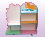 Giá đồ chơi chú mèo là giá có hình con mèo được vẽ nằm trên giáo. phía trong chia ba tầng, KT 80 sâu 25cm cao 90cm, giá được làm bằng gỗ MDF dầy 1,5cm sơn màu kết hợp, giá có bánh xe di chuyển