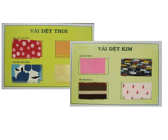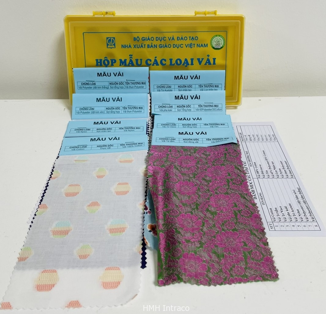 Vải thông dụng thuộc các loại sợi thiên nhiên, sợi hóa học, sợi pha, sợi dệt kim (mỗi loại 2 mẫu).