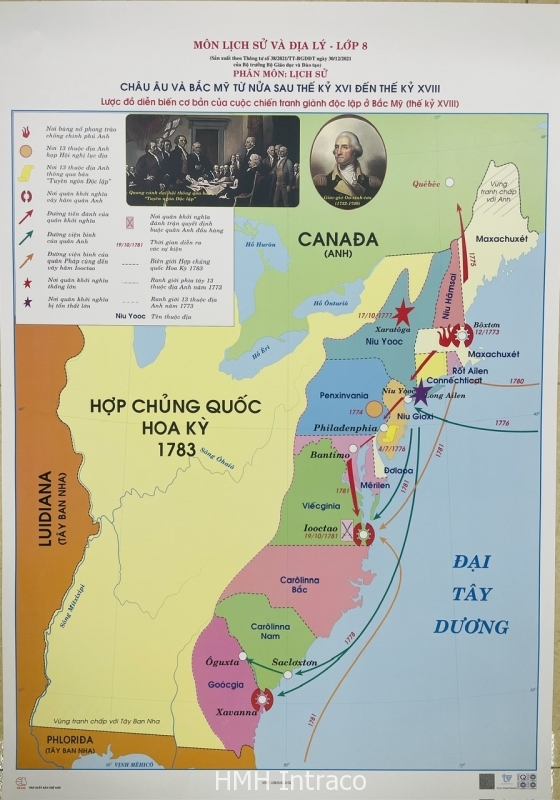 Lược đồ diễn biến cơ bản của cuộc chiến tranh giành độc lập ở Bắc Mỹ (thế kỉ XVIII) là thiết bị môn lịch sử cấp trung học phổ thông Theo Thông tư số 38/2021/TT-BGDĐT ngày 30/12/2021 của Bộ trưởng Bộ Giáo dục và Đào tạo