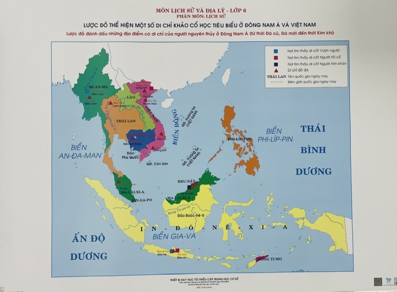 - 01 lược đồ đánh dấu những địa điểm có di chỉ của người nguyên thủy ở Đông Nam Á (từ thời Đá cũ, Đá mới đến thời Kim khí);