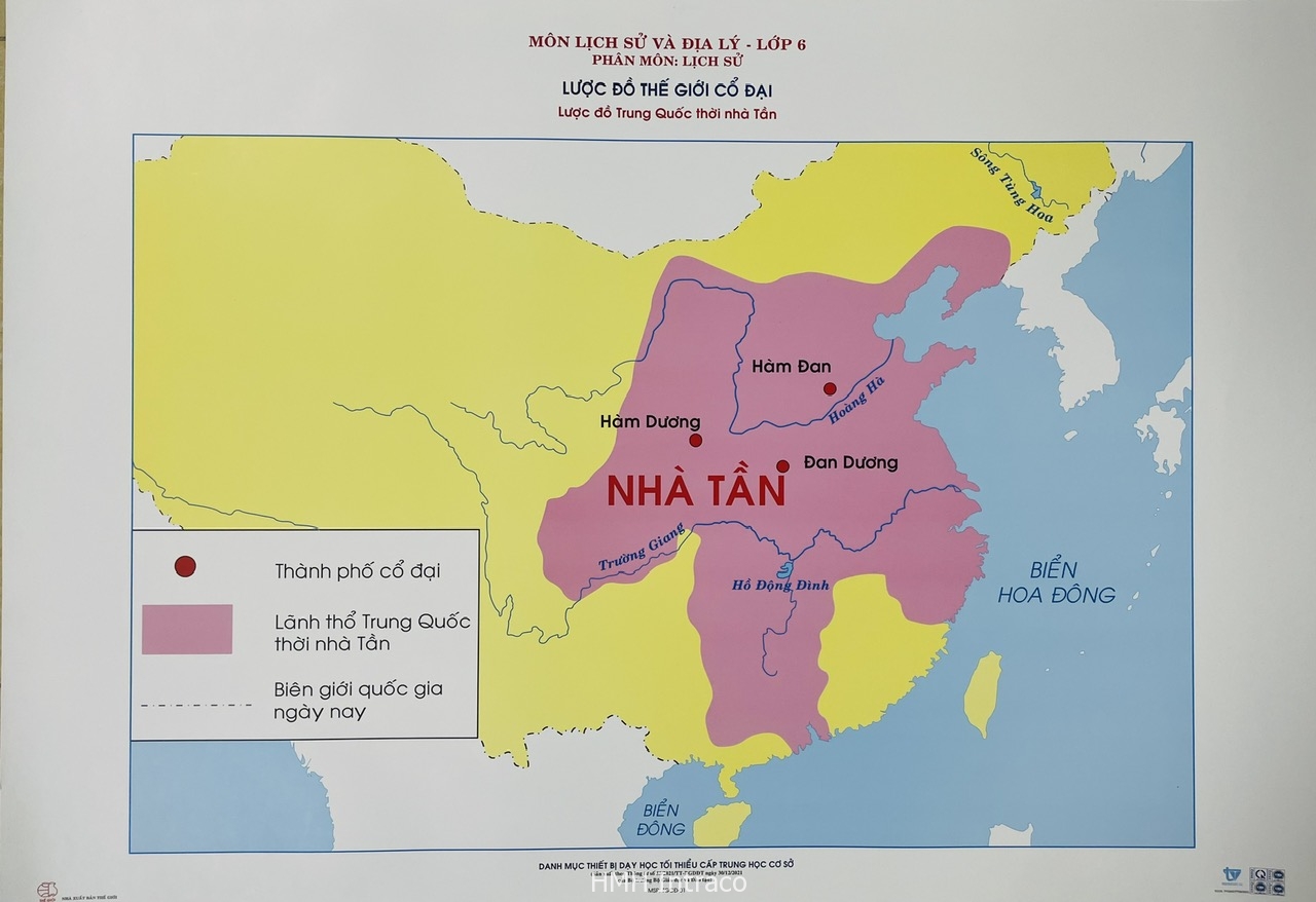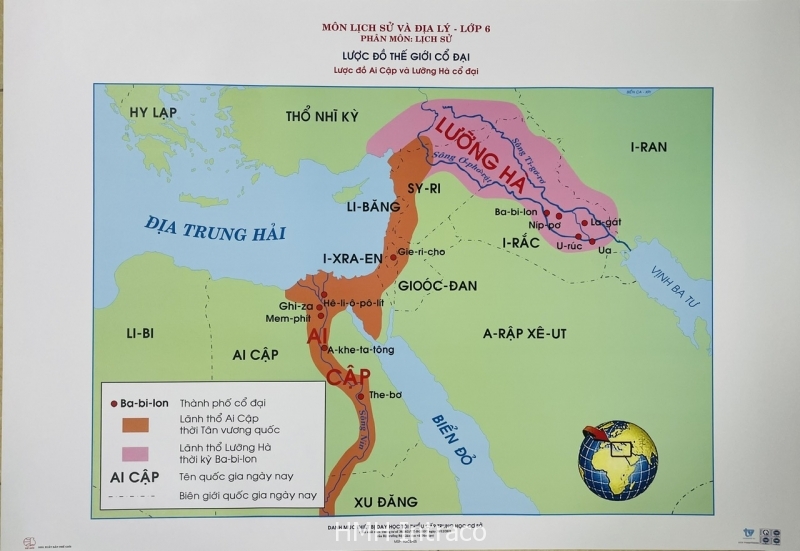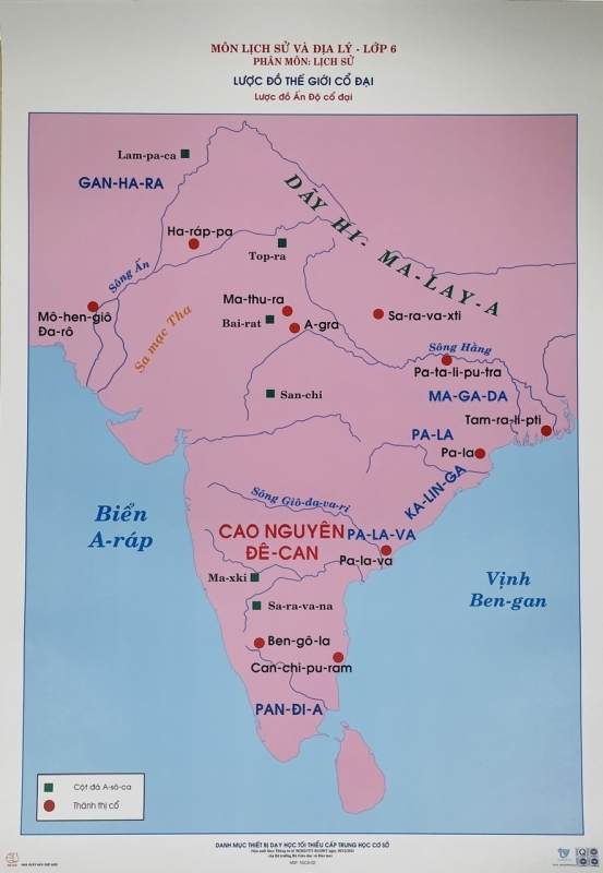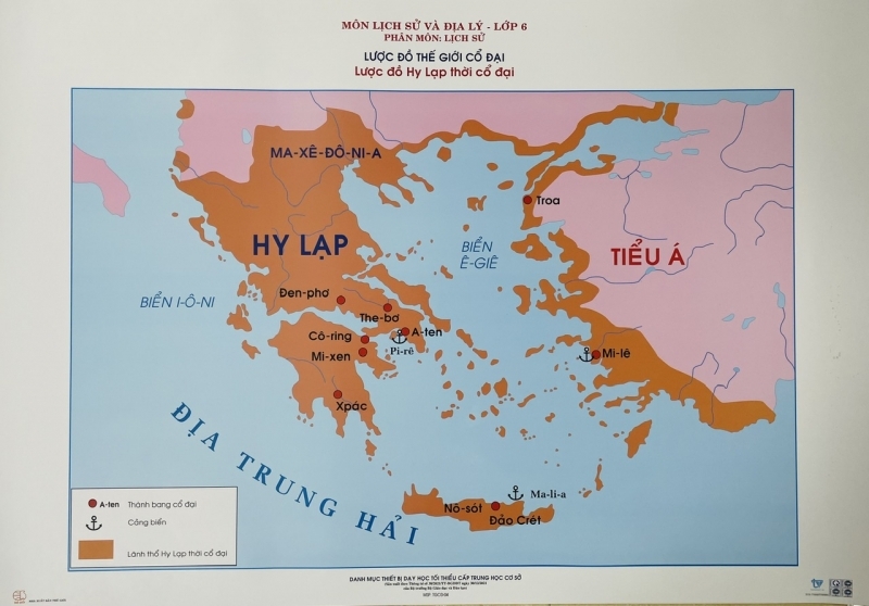 Bộ lược đồ thế giới cổ đại, vị trí địa lý của các quốc gia cổ đại và các trung tâm văn minh lớn, như Trung Quốc, Ấn Độ, La Mã, Hy Lạp, Lưỡng Hà, Ai Cập. Mỗi quốc gia cổ đại có một lược đồ. Kích thước (720x1020)mm, có dung sai 10mm, in offset 4 màu trên giấy couche có định lượng 200g/m2 cán OPP mờ (có thể thay thế bằng tranh/ ảnh điện tử).