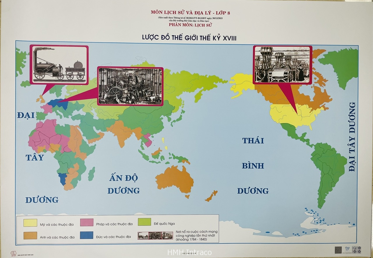 Lược đồ thế giới thế kỉ XVIII là thiết bị môn lịch sử địa lý cấp trung học cơ sở Theo thông tư số 38/2021/TT-BGDĐT ngày 30/12/2021 của Bộ trưởng Bộ Giáo dục và Đào tạo