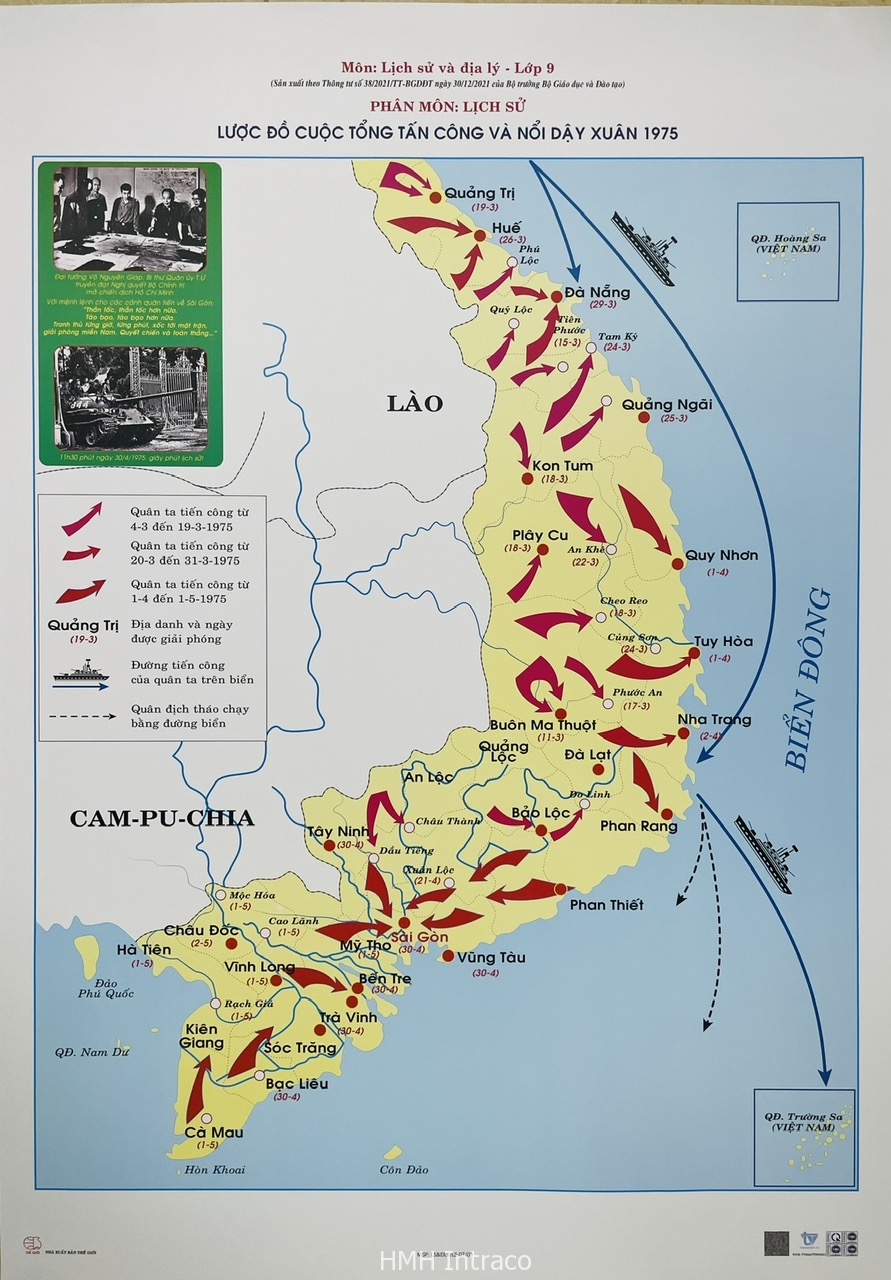 - Lược đồ treo tường. Nội dung lược đồ thể hiện các địa điểm diễn ra Tổng tiến công và nổi dậy Xuân 1975. Lược đồ có kèm hình ảnh của một số vị trí diễn ra Tổng tiến công;