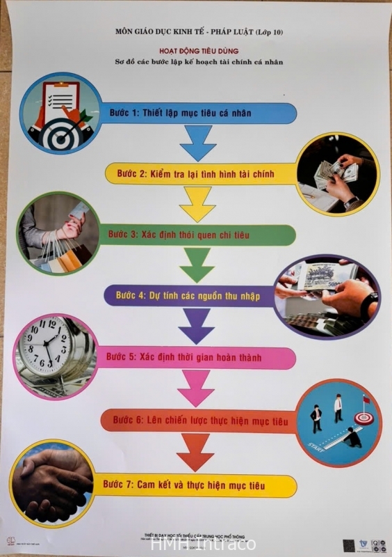 Tranh thể hiện sơ đồ các bước lập kế hoạch tài chính cá nhân là thiết bị môn giáo dục kinh tế pháp luật Theo thông tư số 39/2021/TT-BGDĐT ngày 30/12/2021 của Bộ trưởng Bộ Giáo dục và Đào tạo