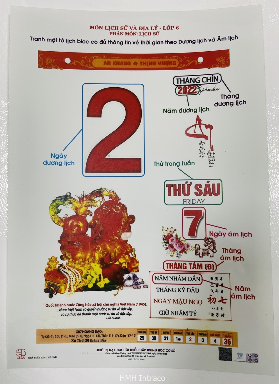01 tờ tranh thể hiện ảnh chụp một tờ lịch bloc in trên tấm nhựa dày 0.5mm khổ (210x297)mm (có thể thay thế bằng tranh/ ảnh điện tử), có đầy đủ thông tin về thời gian theo Dương lịch và Âm lịch. (Các thông tin chi tiết, rõ ràng, có hướng dẫn HS khai thác thông tin; loại bỏ các thông tin không liên quan, như thông tín quảng cáo, các câu danh ngôn, ngày kỷ niệm)