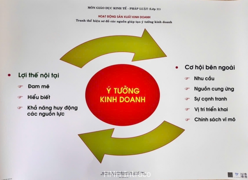 Tranh gồm 1 tờ, có hình rõ nét, đẹp, màu sắc sinh động, minh hoạ bằng sơ đồ các nội dung sau: Các nguồn giúp tạo ý tưởng kinh doanh